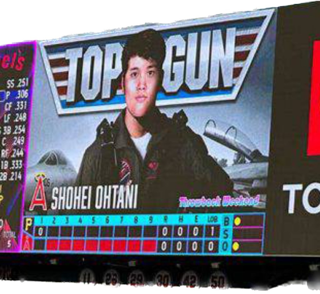 米大リーグ・エンゼルスの大谷翔平投手は21日(日本時間22日)の本拠地パイレーツ戦で「2番・投手」で出場。1回裏の第1打席では電光掲示板に大ヒット映画にちなんだ「トップガン大谷」が大写しになり、エンゼルスタジアムは一気に盛り上がった。